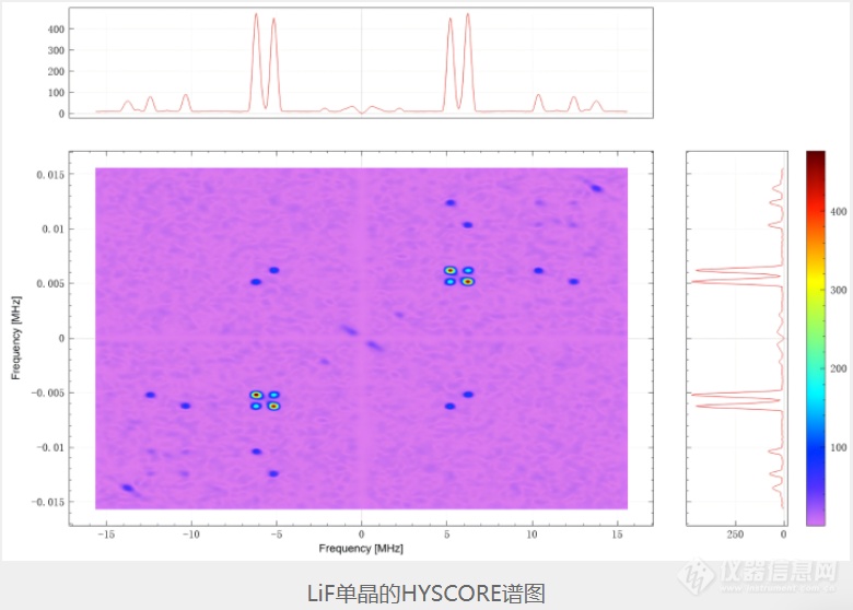 HYSCORE(hyperfine sublevel correlation)是ESEEM的二维谱图,能解析ESEEM中相互重叠的吸收峰。通过HYSCORE实验不仅能测到原子核的Larmor频率,推断原子核的种类,还能得到超精细耦合信息,从而区分不同核的超精细耦合大小,可对原子核进行选择性探测。