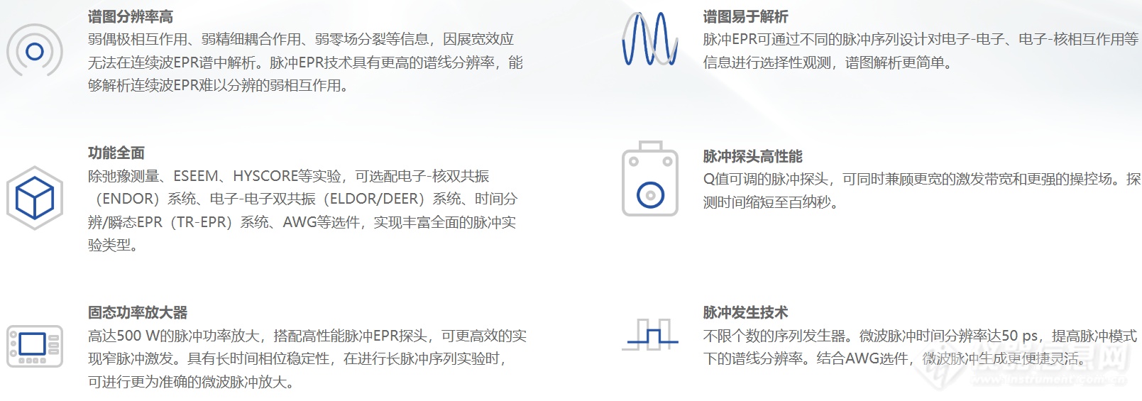EPR100是一款功能全面,性能优异的X波段脉冲式电子顺磁共振波谱仪,兼具连续波EPR及脉冲EPR功能,除了满足常规连续波EPR实验,也可通过特定的脉冲序列对电子自旋量子态进行精细操控及测量,进行T1、T2、ESEEM(电子-自旋回波包络调制)、HYSCORE(超精细亚能级相关)等脉冲EPR相关测试。EPR100的选配件丰富全面,例如选配ENDOR、DEER、TR-EPR、AWG等配件,满可足当前所有脉冲实验模式的需求;搭配变温系统,可实现超低温下顺磁性物质的探测。脉冲EPR可实现更高的谱图分辨率,揭示电子与核之间的超精细相互作用,从而为用户提供更多的物质结构信息,在材料科学、量子计算、生物结构解析等科学研究领域具有不可替代的重要作用。